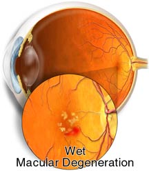 Patients with wet macular degeneration develop new blood vessels under the retina. This causes haemorrhage, swelling, and scar tissue but it can be treated with laser in some cases.